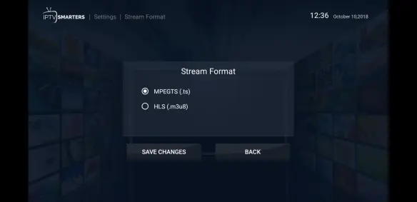 Una vez ingresado nos dirigimos a SETTINGS → STREAM FORMAT → seleccionar MPGETS y luego SAVE CHANGES. Estos cambios son importantes para no tener problemas de reproducción.